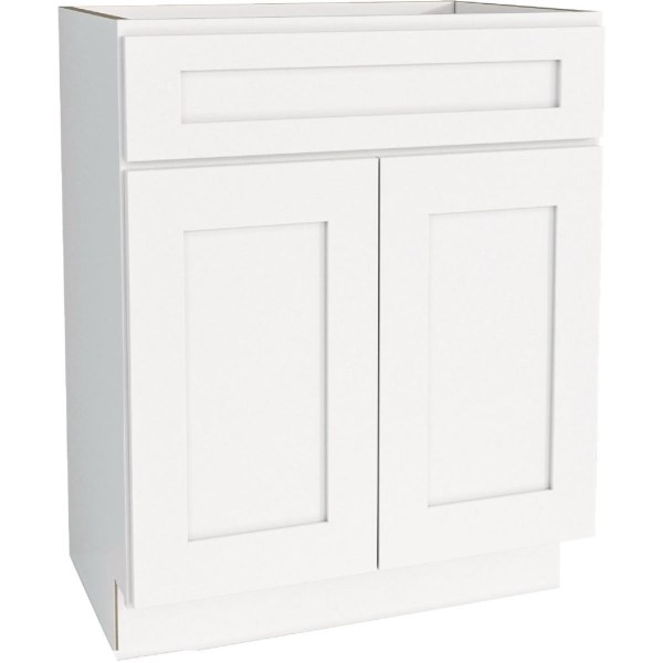 The Plymouth Shaker White Collection from CraftMark features the timeless clean design lines of Shaker furniture combined with our Designer white finish. The result is a casually contemporary cabinet collection that has a wide appeal and complements many interior design styles. All CraftMark collections feature generous storage, quality materials and durable construction. CraftMarks all wood no particle board shaker kitchen base cabinet. Finished in our designer white paint. Cabinet has 1 drawer and 2 doors. Cabinet standard features include: solid wood dovetail drawers, soft close drawer glides and soft close hinges, matching painted interior, solid plywood sides with framed back mounting plate. The interior bottom shelve is thick and also is depth to give you an extra 20% of storage. Cabinets also come standard with a finished kick plate and finished exterior side panels. Easy ready to assemble.
