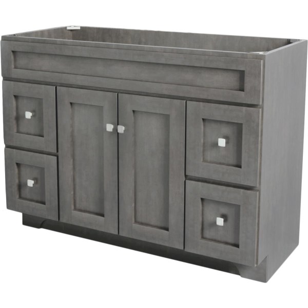 Style, function and value are the attributes of the Shaker designed St. Paul collection featuring solid wood face frame, drawer fronts, and doors with solid plywood box construction (no particle board). Vanity is as durable as it is stunning. Doors feature soft close hinges, and drawers are constructed out of solid plywood with dual under mount glides for ease of use. Additionally, the drawers are full height construction to add extra storage space. Designer translucent gray stained finish, oversized designer chrome hardware and decorative kick plate enhances any bathroom. Ready to assemble vanity base. Vanity top not included.