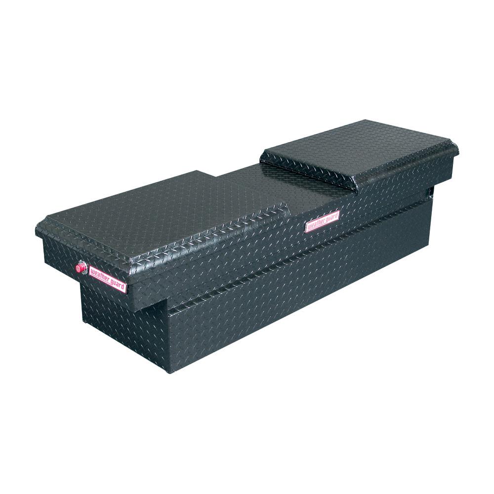 Access your tools and supplies from the left or right side of your truck when you use the WEATHER GUARD?? Aluminum Cross Box (Black) Full Size. Its gull-wing covers open separately and feature one-touch rotary latches to make access easy. They also have break-in-resistant EXTREME PROTECTION?? retracting locks to keep all of your contents safe. The Weather Guard cross box fits 6-1/2- or 8-foot beds on any full-size pickup truck. This box hangs suspended over the sides of the truck, so there’s enough space below it for storage. Inside, the truck storage box boasts a steel divider tray,12-volt access and 11.3 cubic feet to accommodate all of your tools. For protection against the elements, the exterior features an ARMOR-TUF?? powder-coat finish and a weather seal. These ensure the aluminum truck cross box will be dependable for years.