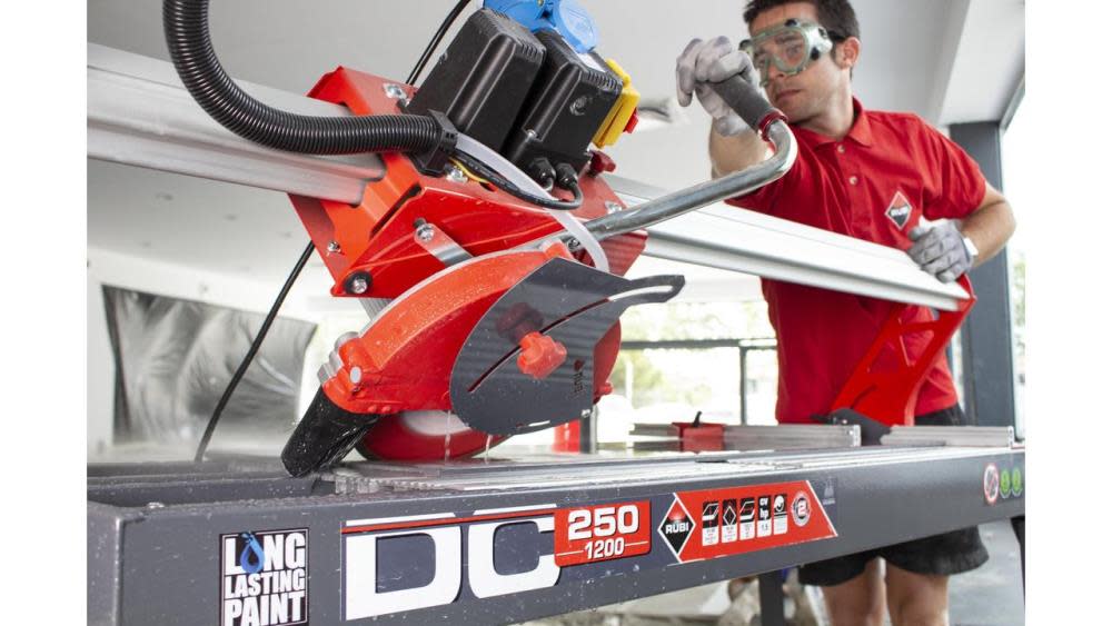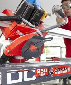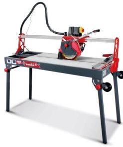 The Rubi DC-250 1200 is a professional 1.5 HP tile saw that has a brand new precision moving head and rail system. Ideal for large formats of ceramic, porcelain, marble, glass, stone and other materials. Plunge cut and miter cut. This wet saw features 47-1/2 In. straight rip capacity (including plunge cut) and 33 In. diagonal rip capacity. 99.9% of 48 In. tiles actually measure less than 47-1/2 In., that is why this saw is a 48 In. tile saw. At only 126 Lb., this professional tile saw can be transported to and around the jobsite by only one person using the wheels for transportation. Extruded aluminum tables, removable for easy cleaning of the machine. It includes a premium 10 In. blade and cable. 2 years warranty.