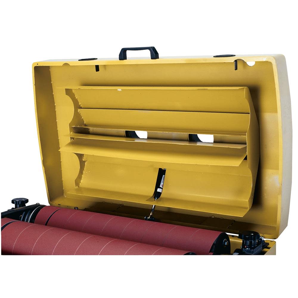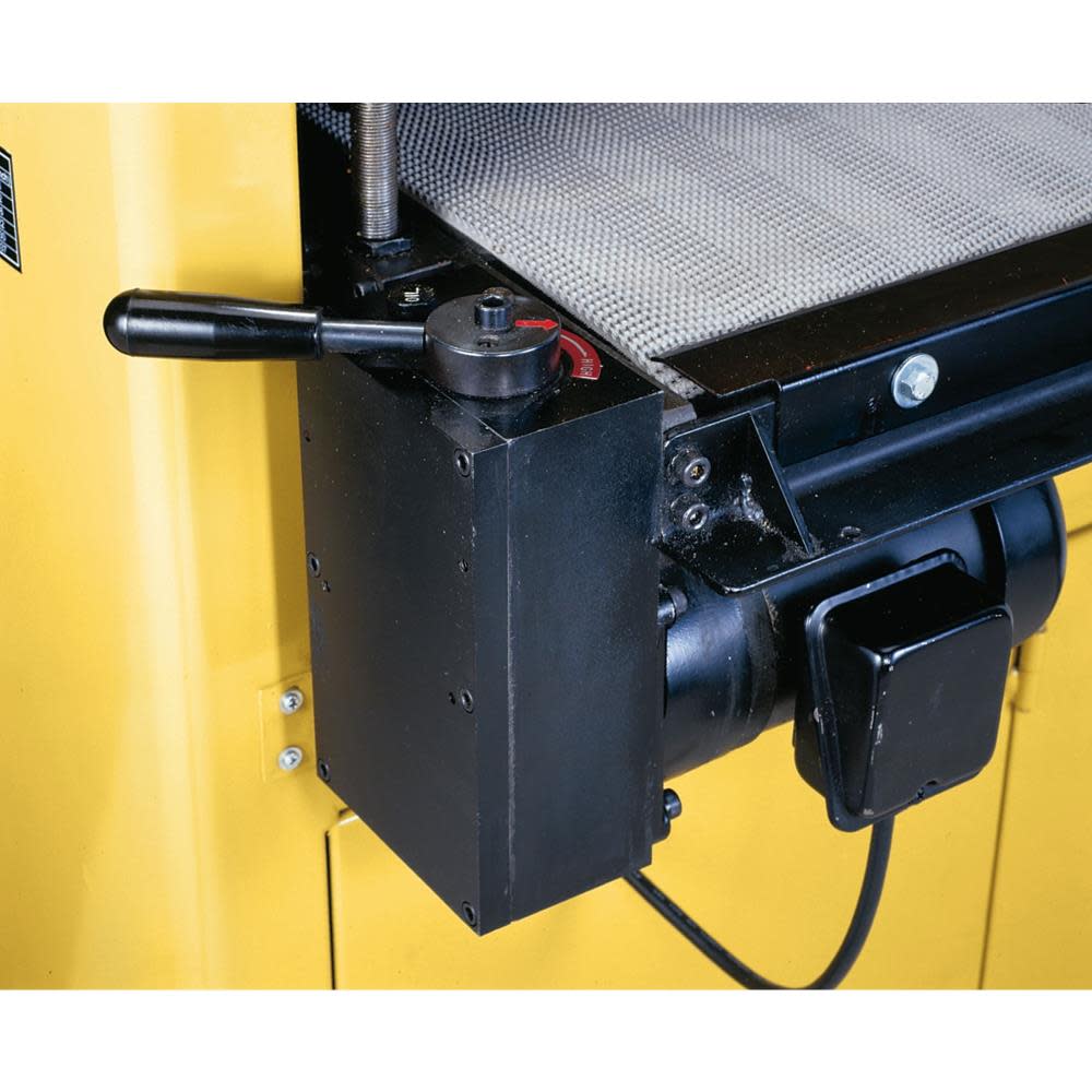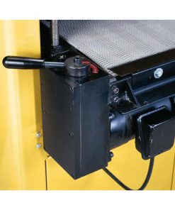 Finally, a production class dual drum sander that is loaded with features. This machine features a 5 HP motor to power the twin poly V-belts. The dual steel drums have a hard durometer rubber coating to assure a flat, mar free finish. Independently adjustable rear drum makes fine tuning easy. A heavy cast iron table incorporates four solid jack screws with chain drive timing to keep it level at all times. The heavy-duty poly conveyor belt provides a positive grip on the stock. The 1/4 HP feed motor is coupled to a two-speed forward/reverse gearbox that will sand 8 and 12 surface feet per minute. The heavy steel cabinet provides years of vibration free sanding, with plenty of storage space underneath.