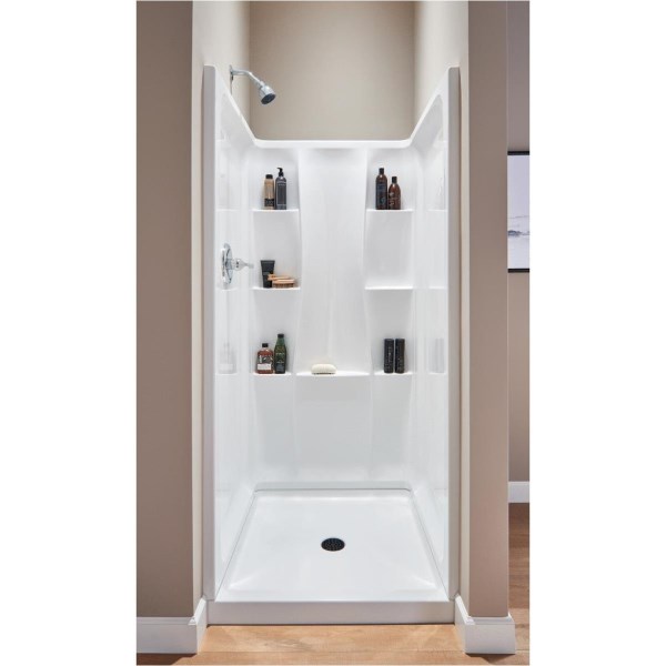 Premium high-gloss non-porous ProCrylic surface is durable, easy to clean and resists mildew. Bright white finish matches porcelain fixtures. Seven built-in shelves provide much needed storage space. Built-in nailing flange helps ease installation. Direct-to-stud installation helps create a long-lasting and secure unit. Easy to handle material with no fiberglass backing. No mortar bed required saves time and money. Recommended adhesive: DAP 3.0, RD 3000, and ECO-BOND. Three-piece design is easy to transport. 10 year limited residential warranty. 1 year limited commercial warranty. Wall set only – Shower base not included.