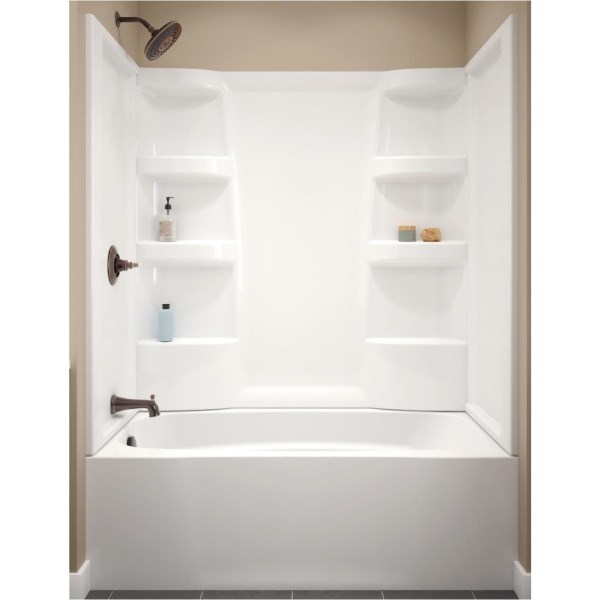 Offers style, design, and durability with a durable, bright-white, high-gloss material. Easy to handle and install, with no fiberglass backing. Acrylic shower panels feature seven large shelves and deep ledges for beauty product storage. Direct-to-stud installation for increased stability. Includes nailing flange. Three piece installation. 10 year limited residential warranty, 1 year limited commercial warranty. Wall set only – bathtub not included.