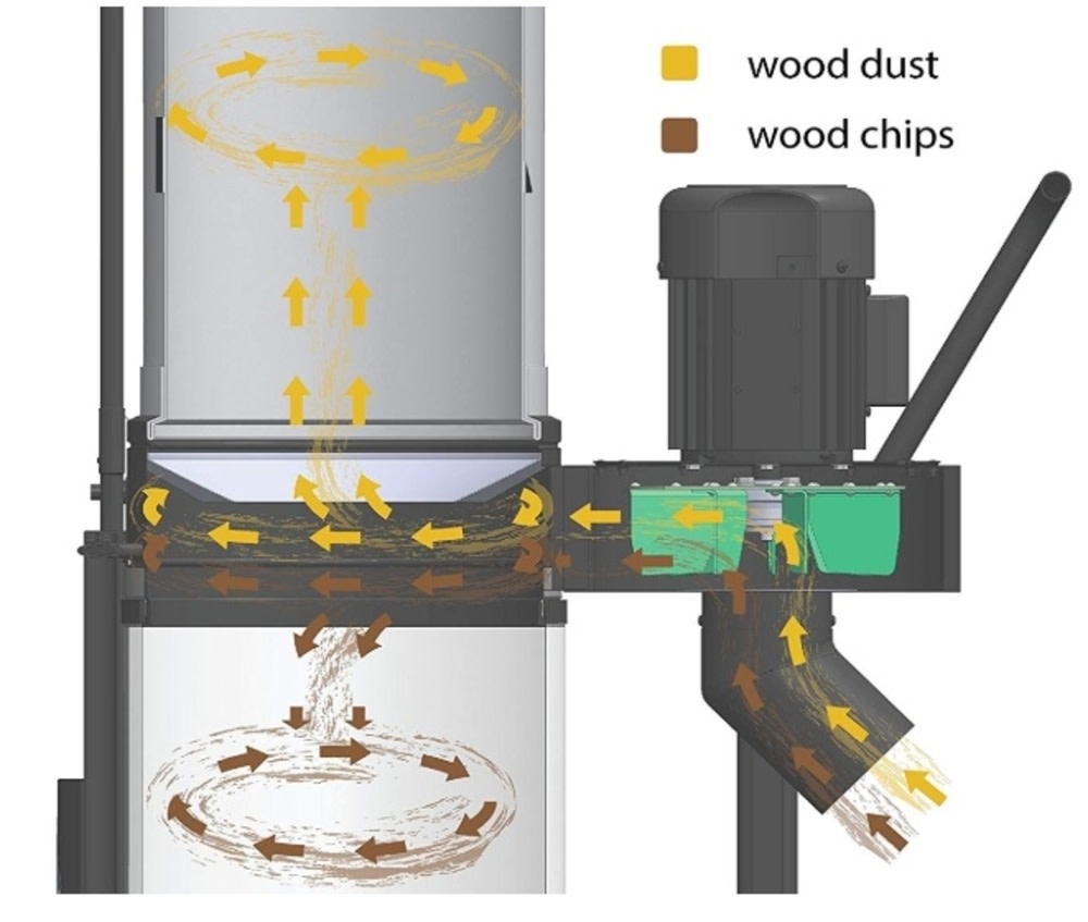 Delta downdraft chip separator technology utilizes a special baffle design to create air movement inside the bag to draw dust down into the disposal bag and minimize dust in the top bag