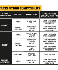 Engineered for carbon steel (black iron pipe) pipe pressing, this adaptable 1/2 in. to 1 in. Standard Press Iron Pipe Size (IPS) Jaws Kit is designed to deliver balanced distribution of force while maintaining long-term, professional-grade durability. Defend against corrosion and rust buildup with a black, galvanized finish. These press jaws are built for use with the DEWALT? 20V MAX* Press Tool DCE200 (sold separately) and are compatible with most widely used professional-grade press fittings. Keep everything organized with the included TOUGHSYSTEM? 2.0 Tool Box.