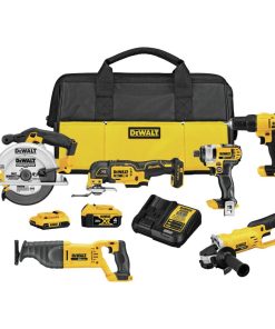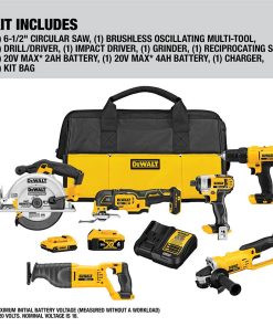 The DEWALT 20 Volt Max cordless 6-tool combo kit contains a DCD771 1/2 Inch drill/driver, DCS381 reciprocating saw, DCS393 6-1/2 Inch circular saw, DCS356 brushless oscillating multi-tool, DCF885 1/4 Inch impact driver and DCG412 4-1/2 Inch grinder. Tools comes with a 20 Volt Max 2.0 Amp-hours battery, 20 Volt Max 4.0 Amp-hours battery, charger and bag. The circular saw with 6-1/2 Inch carbide blade can cut 2x4s at a 45 degree angle in a single pass. Cordless reciprocating saw with keyless blade clamp allows for quick blade changes without touching the blade or reciprocating shaft. The drill/driver has a high-speed transmission with two speeds that is 0 – 450 and 1500 RPM for a wide range of fastening and drilling applications. Cordless drill/driver has a high-performance motor that delivers 300 unit watts out (UWO) of power ability completing a wide range of applications. Impact driver has 3 LEDs with a 20 second delay after the trigger is released for increased visibility. Cordless impact driver has a compact design that is 5.55 Inch front to back which fits into tight areas. Grinder tool is equipped with an 8000 RPM motor for multiple grinding and cutting applications. Multi-tool has 3-speed selector that allows users to choose their speed setting based on application.