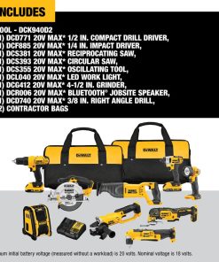 The DEWALT 9-Tool Combo Kit (DCK940D2) features a drill driver, impact driver, reciprocating saw, circular saw, oscillating tool, grinder, right angle drill, Bluetooth speaker and work light. The DCK940D2 is backed by a DEWALT 3-year limited warranty for added peace of mind.
