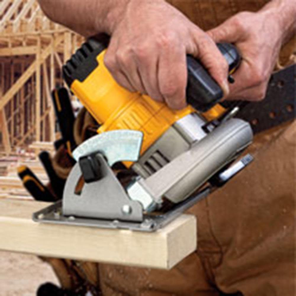 DCS393 20-volt MAX lithium ion circular saw with 6-1/2-in carbide blade can cut a 2 x 4 at a 45 degree angle in a single pass