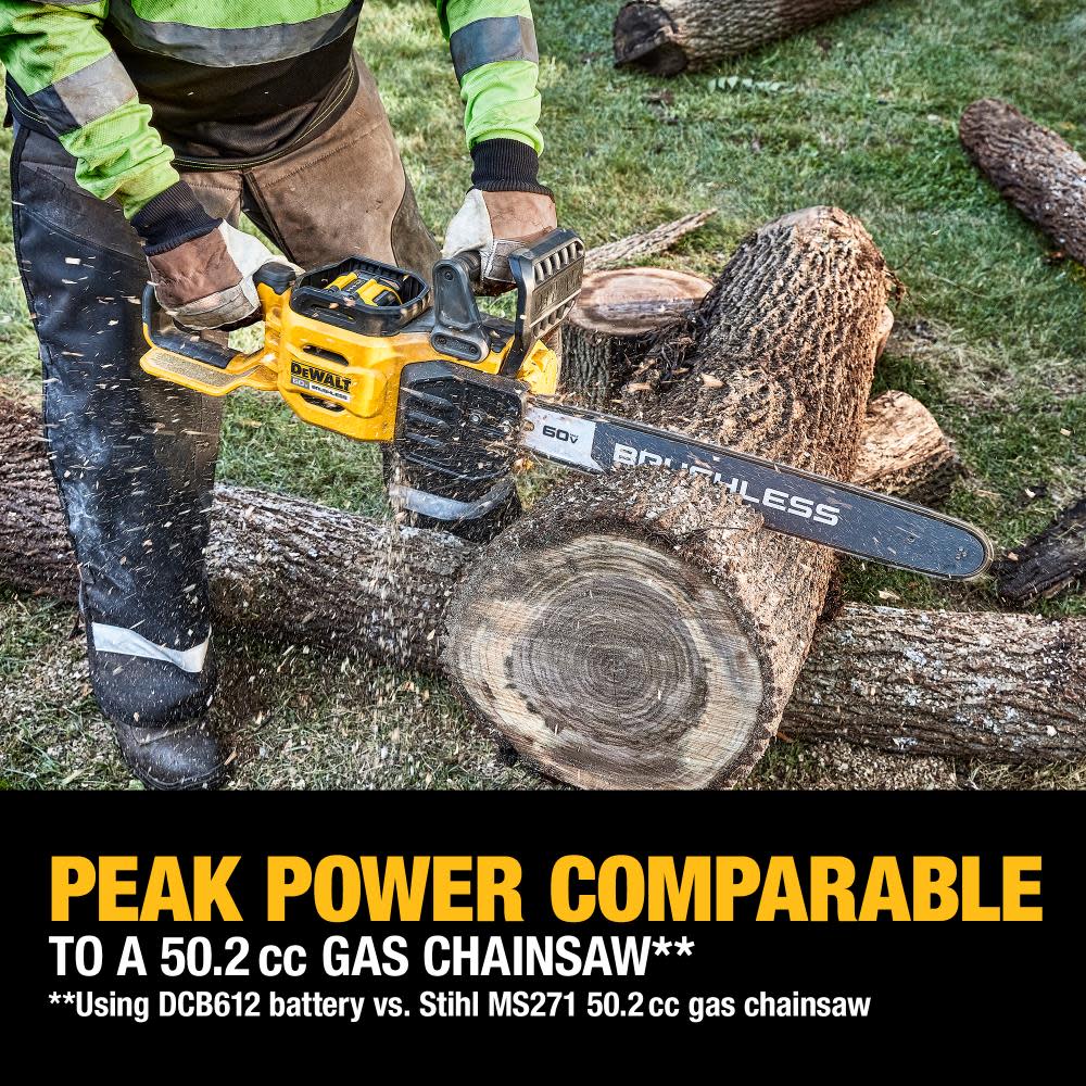 Built to handle almost any cutting, sculpting, and chopping job, this 60V MAX* Brushless Cordless 20 in. Chainsaw packs a high-performance motor that outputs up to 3.49 HP using an optional DCB612 Flexvolt battery. Dependable bar retention is made possible with tooled chain tensioning. The Chainsaws brushless motor delivers peak power comparable to a 50.2 cc Gas Chainsaw** and self-lubricates so you don’t have to stop to add oil. Seamlessly cut through thick material with the low kick back bar and chain brake for added kick back protection.