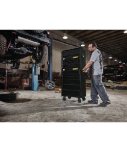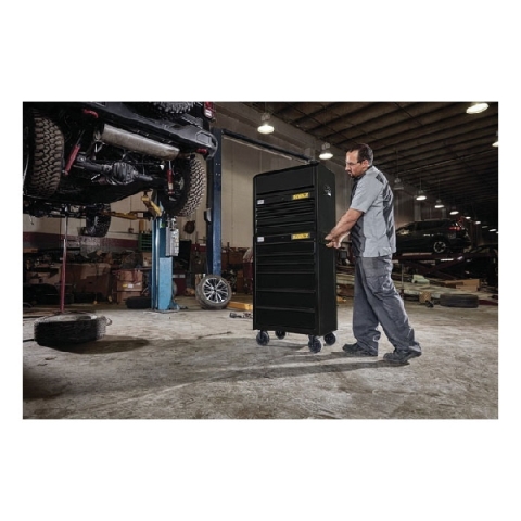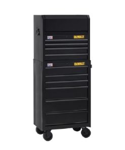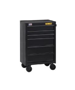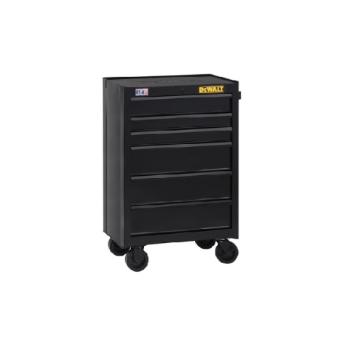 This 26 in wide six drawer rolling tool cabinet is constructed of double-wall steel for strength and durability. It has six 100 lb load capacity drawers with soft close latching for smooth and quiet operation. It also has a heavy-duty keyed internal locking system to safeguard tools. Conveniently charge your power tools, batteries and electronics from the side of the cabinet. Its load rating is 1500 lb with reinforced mounting channels and it has four 5 x 2 in casters, two of which lock and swivel. A full-grip tubular side handle with a comfortable black overmold is included for ease of mobility. Also included are six DeWALT embossed drawer liners and one DeWALT embossed top mat to help protect the cabinet surface.