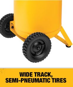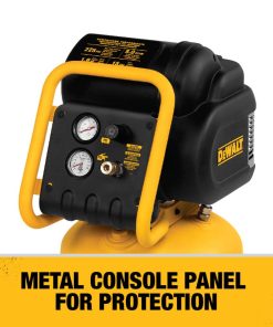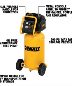 The DeWalt 15 Gallon Workshop Compressor features a 1.6 HP electric motor for extra power, with an operating maximum pressure of 200 PSI. This motor can run on a 12-gauge extension cord. It operates at a decibel level of 78 to keep workshop noise to a minimum. The steel tank holds 15 gallons and will stand up to all kinds of wear and tear. It has an oil-free pump for easier maintenance. The convenient top-mounted PSI regulator controls and gauges make it easier to control and monitor tank, and regulator pressure. It has a ball valve on the bottom for convenient and safe draining. The padded front feet and reinforced tires increase stability while in use. Pair this 15 gallon compressor with your favorite DeWalt nailers and staplers. The extra large wheels make moving the DeWalt 15 Gallon Workshop Compressor easier in a crowded workshop or worksite.
