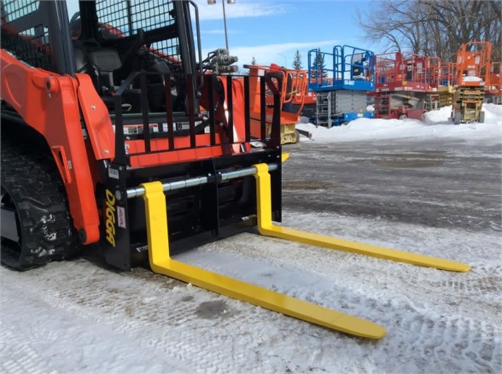 STK# PF-001130-4000 New DIGGA PF-4000 Pallet Forks, Universal Skid Steer Mounting Plate, Folding Safety Guard FLOATING TYNE DESIGN A floating tyne design offers unparalleled safety for skid steer loaders. Unlike forklifts, skid steers are able to crowd their pickup past horizontal allowing the machine to be placed in an unsafe position which could cause it to tip over. Digga??s pallet fork design allows the tynes to swing freely from a single lockable point ensuring load and operator safety. Furthermore the design prevents the machine??s weight to be placed on the tynes which could cause them to break. SLIM DESIGN PACKAGING Designed for easy handling, shipping and storage. Assembly is simple and quick Specifications Model PF-4000 Length 57″ Height 38″ Width 46″ Weight 346 lbs. Tyne Length 48″ Acme Equipment is here to provide you all of the information you need to make an educated purchase, as well as support you after the sale with parts, service, and warranty. Let us help you make a great investment. *** We Ship To All 50 States. We Have a Loading Dock, Forklift and Loading Personnel ***