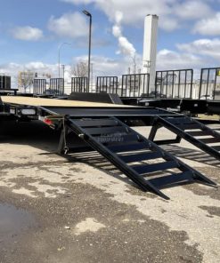 Specifications: Model XT8420. Bed Length 20′. Bed Width 84″. GVWR 9,800 lbs. Axle Rating 5,200 lbs.. Brakes Electric on both Axles. Deck Material 2″ Treated Lumber. Ramps 60″ Flip-Up Knee Ramps. Lights All LED. Paint Color Black.