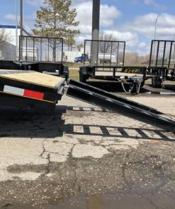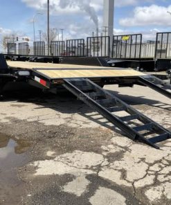 Specifications: Model CF841898K. Deck Length 18′. Deck Width 84″. GVWR 9,800 lbs.. Axle Rating 5,200 lbs. Brakes Electric on both axles. Dove Tail 24″. Ramps 60″ Slide-In. Deck 2″ Treated Wood. Lights All LED. Paint Color Black.