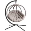 Elegant hanging chair also converts into a standing chair. Features a comfortable seat cushion and head rest with durable olefin fabric for long life. Sturdy wicker & steel frame provides stability.