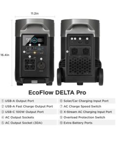 Capacity: 3600Wh, Extra Battery: Support up to two DELTA Pro Smart Extra Battery/Smart Generator, AC Output: 5 outlets, 3600W total (Surge 7200W), Max Device(s) Power Supported by X-Boost: 4500W, USB-A Output: 2 ports, 5V, 2.4A, 12W Max per port,,USB-A Fast Charge,2 ports, 5V, 2.4A / 9V, 2A / 12V, 1.5A, 18W Max per port,,USB-C Output,2 ports, 5/9/12/15/20V, 5A, 100W Max per port, Car Power Output: 12.6V, 10A, 126W Max