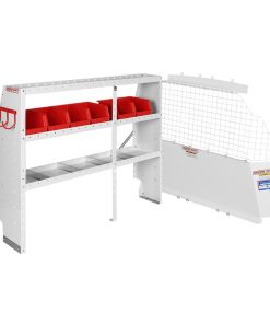Includes 44in high adjustable cargo van shelving and a mesh van bulkhead