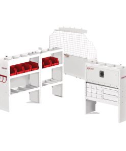 Includes 44in high adjustable cargo van shelving and a mesh van bulkhead