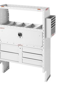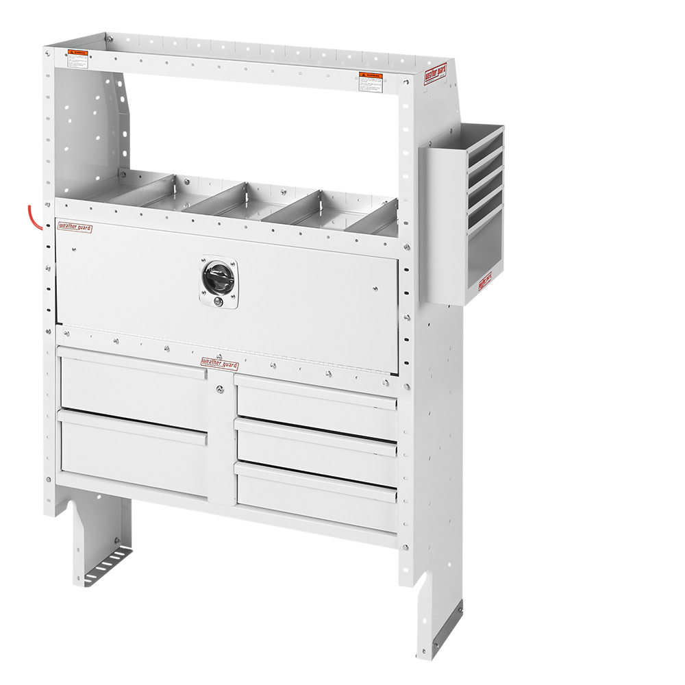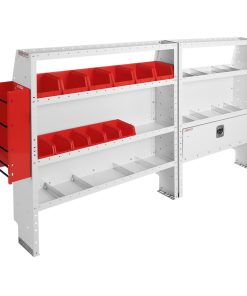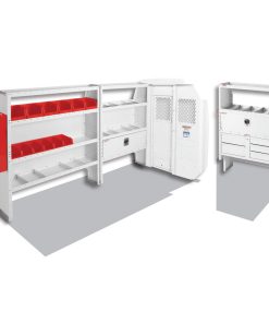 Designed for electricians and electrical contractors, the WEATHER GUARD Model 600-8214R van package for Mid-Roof, 130in wheel base Ford Transit vans provides adjustable cargo van shelving sized to fit the commercial van interior, shelf doors, 12 storage bins, a wire spool holder and accessories. It includes a sturdy van bulkhead for maximum protection against shifting loads. Additional van products are available to create a custom van solution.
