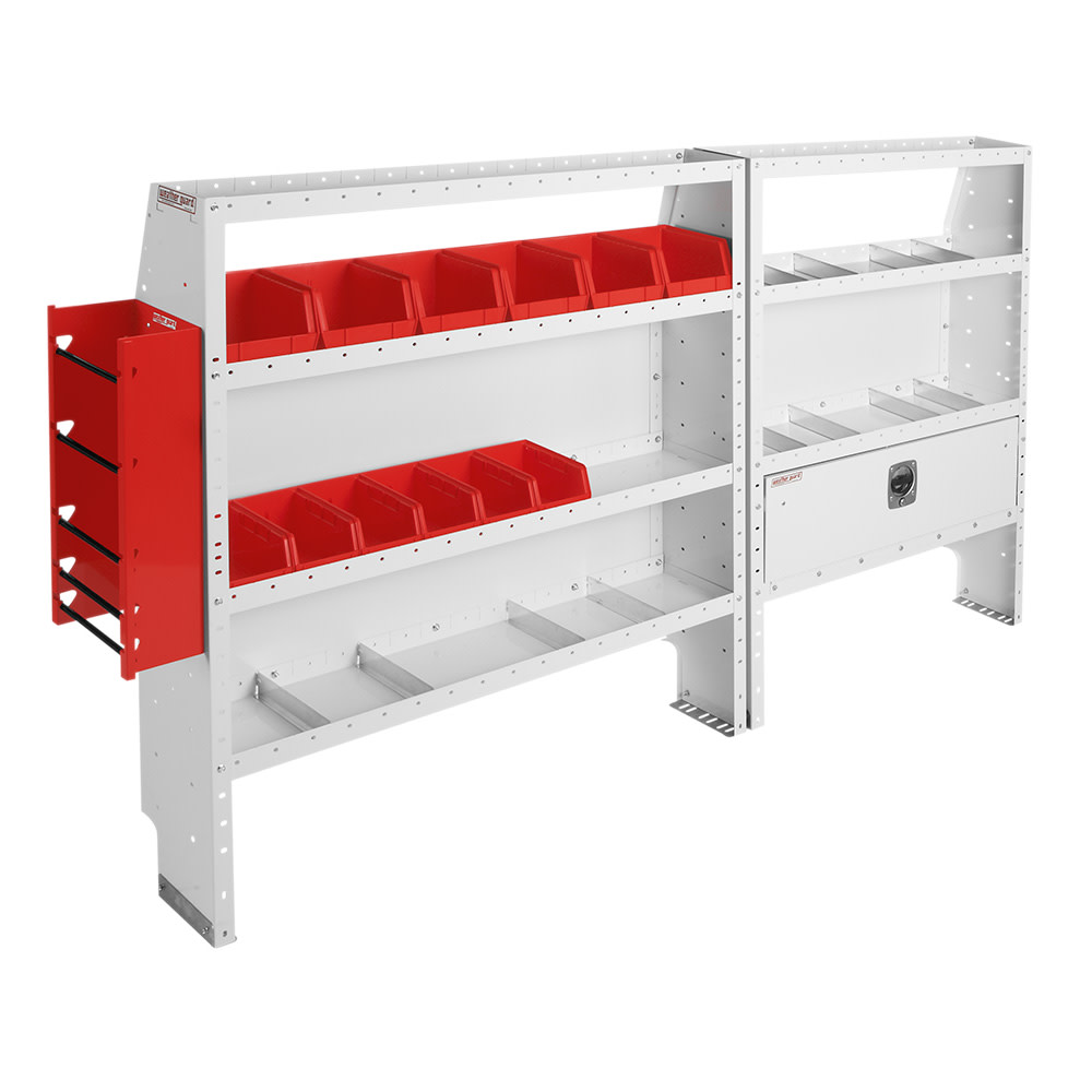 Includes 60in high adjustable cargo shelving and a mesh van bulkhead with swinging door kit