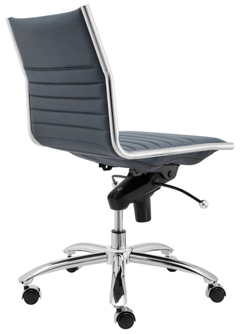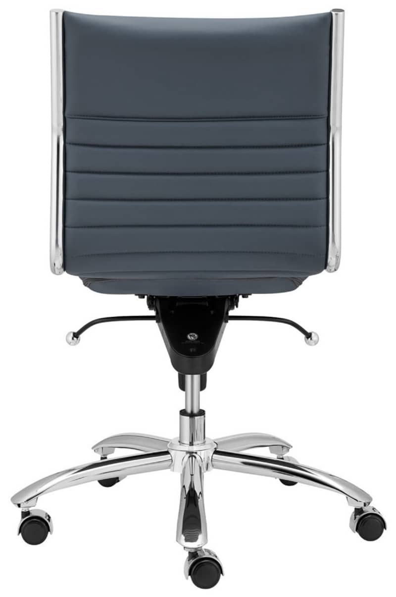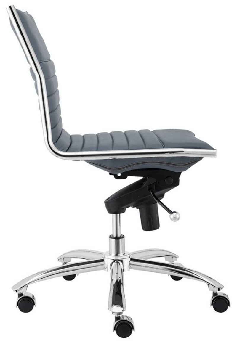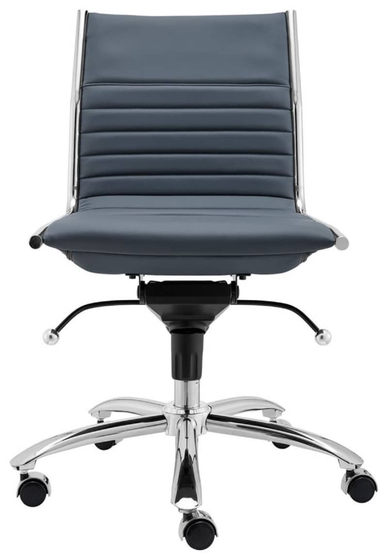 Euro Style 01266BLU Dirk Low Back Office Chair Without Armrests In Blue w/ Chromed Steel BaseHigh back or low, armrests or not, the Dirk Office Chair design is very popular for all the right reasons. The seat and back are constructed into a single piece for a finished look, while inside the seat and back are flat bungie bands which offer an outstanding level of comfort that is famous worldwide. With stunning design and a variety of color options, the Dirk is perfect for any office space. Features