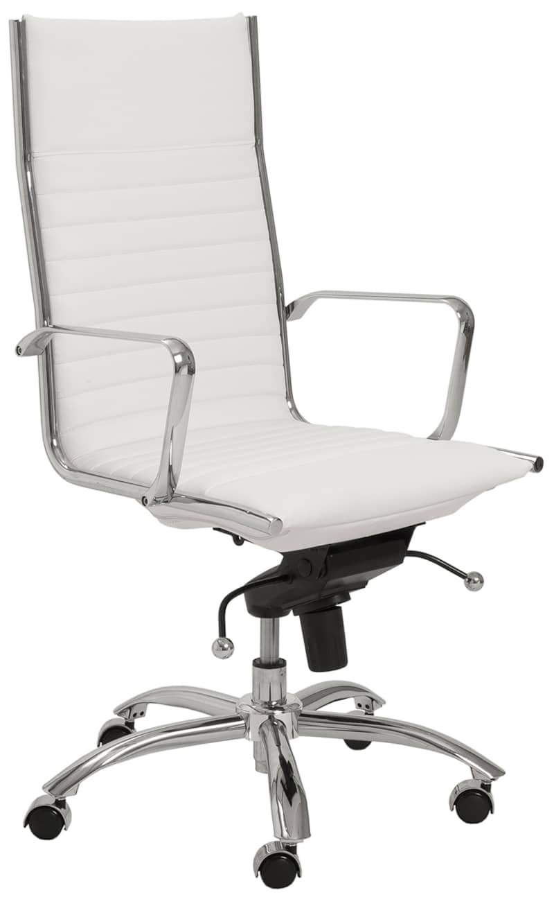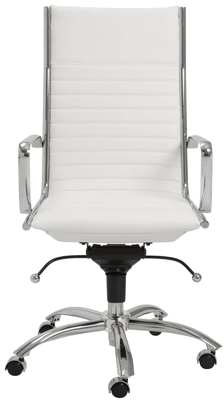 Euro Style 00675WHT Dirk High Back Office Chair in White w/ Chromed Steel BaseHigh back or low, armrests or not, the Dirk Office Chair design is very popular for all the right reasons. The seat and back are constructed into a single piece for a finished look, while inside the seat and back are flat bungie bands which offer an outstanding level of comfort that is famous worldwide. With stunning design and a variety of color options, the Dirk is perfect for any office space. Features