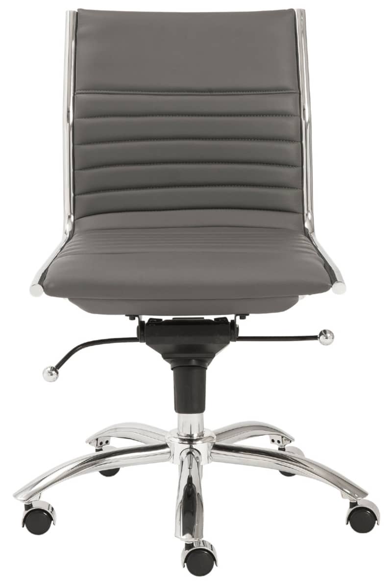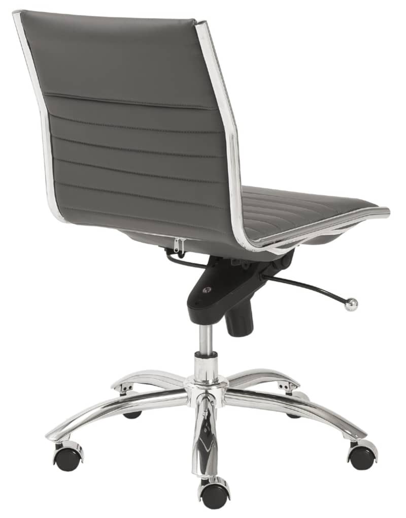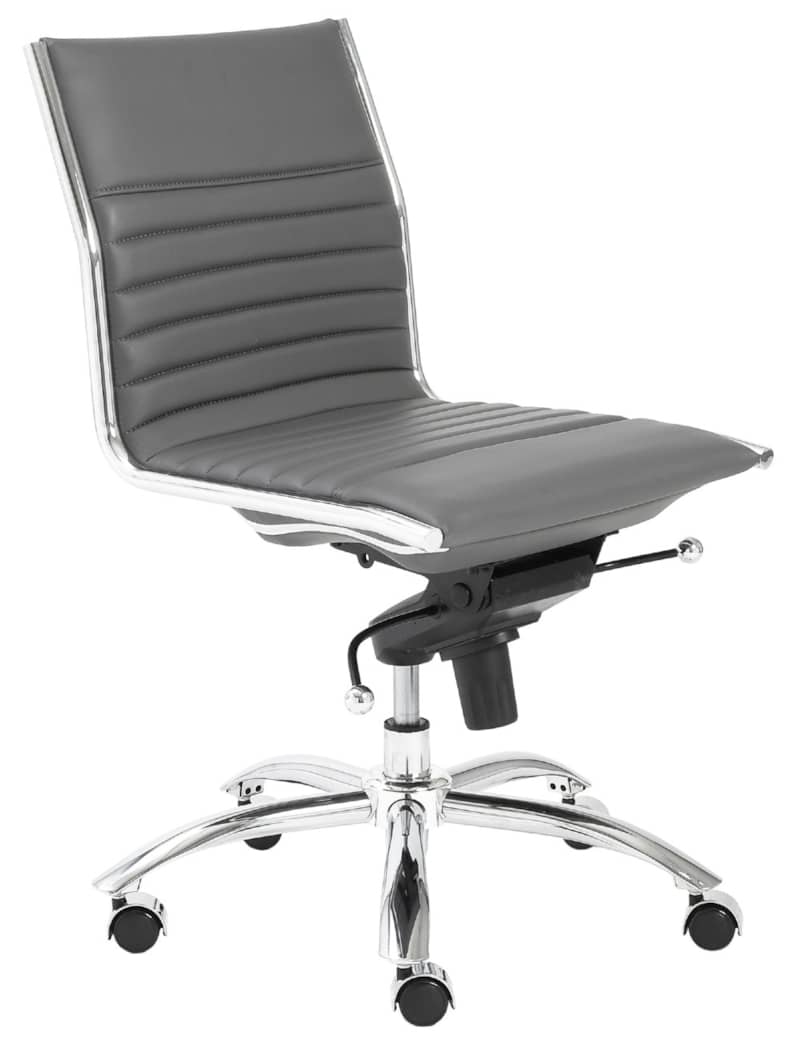 Euro Style 01266GRY Gray Dirk Low Back Office Chair Without Armrests In Gray w/ Chromed Steel BaseHigh back or low, armrests or not, the Dirk Office Chair design is very popular for all the right reasons. The seat and back are constructed into a single piece for a finished look, while inside the seat and back are flat bungie bands which offer an outstanding level of comfort that is famous worldwide. With stunning design and a variety of color options, the Dirk is perfect for any office space. Features