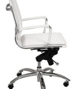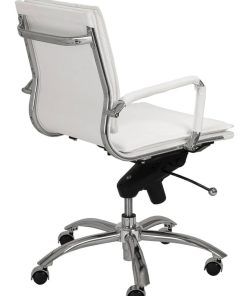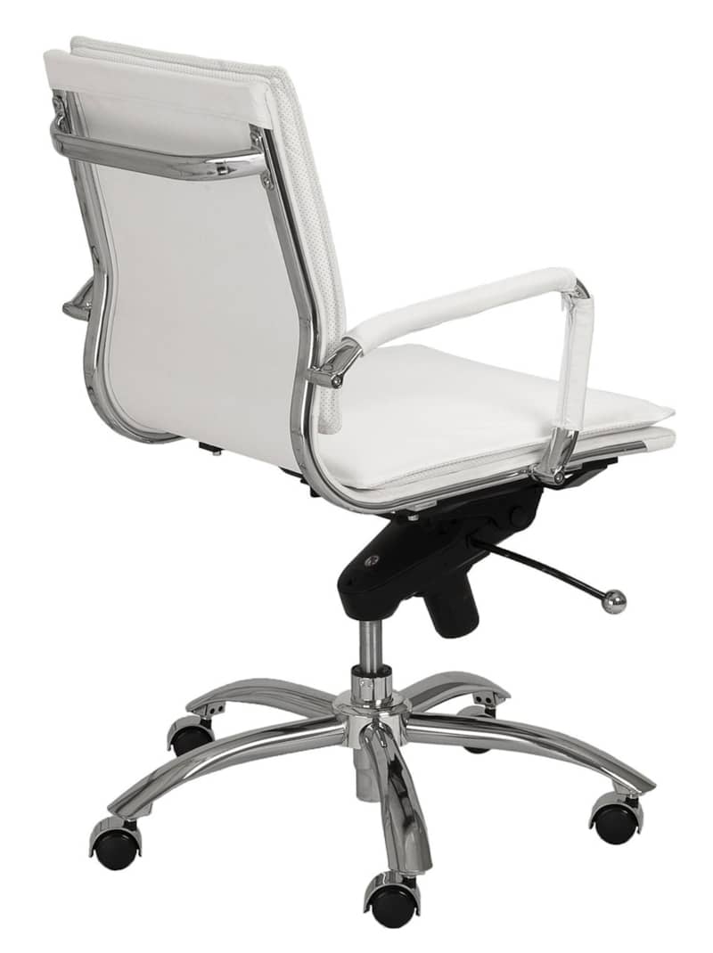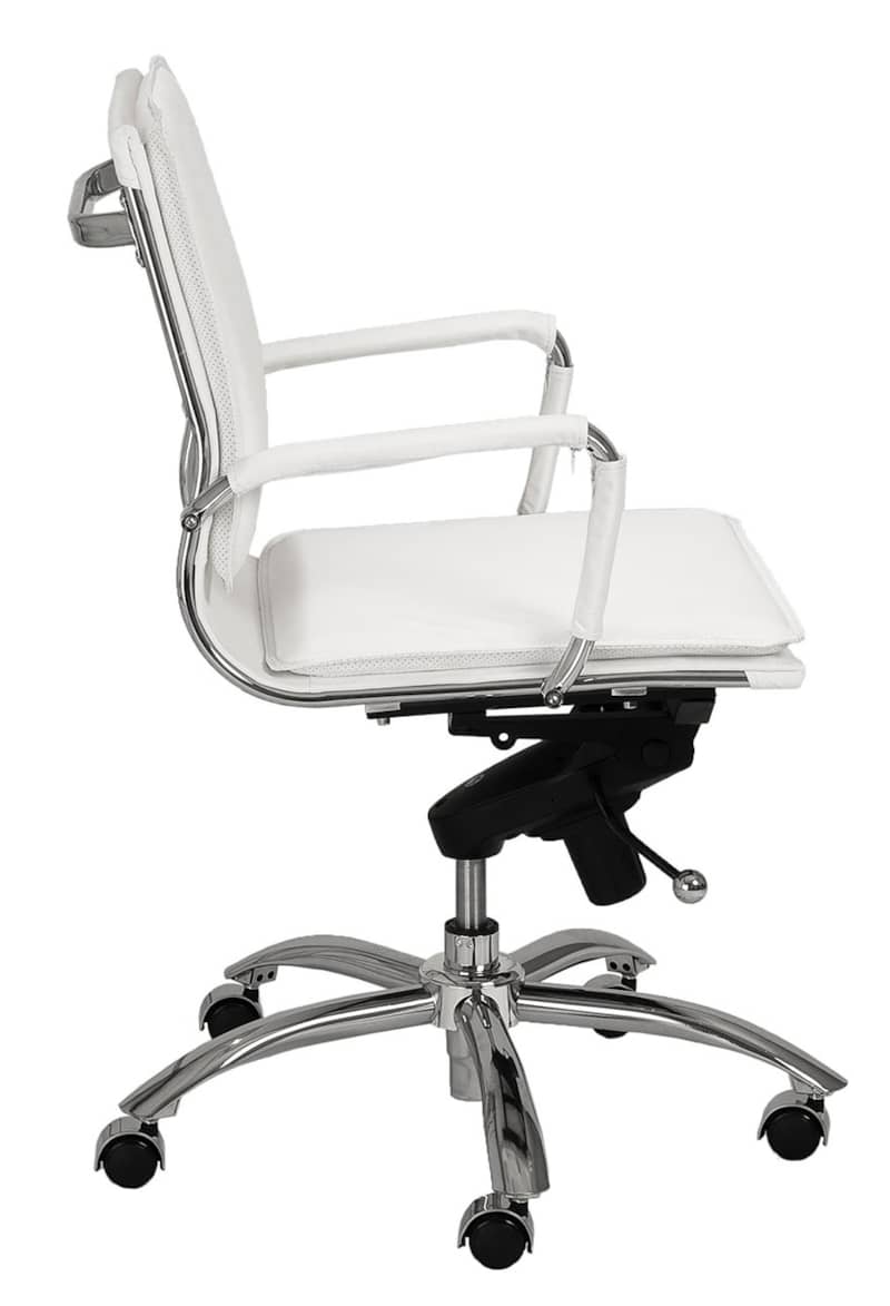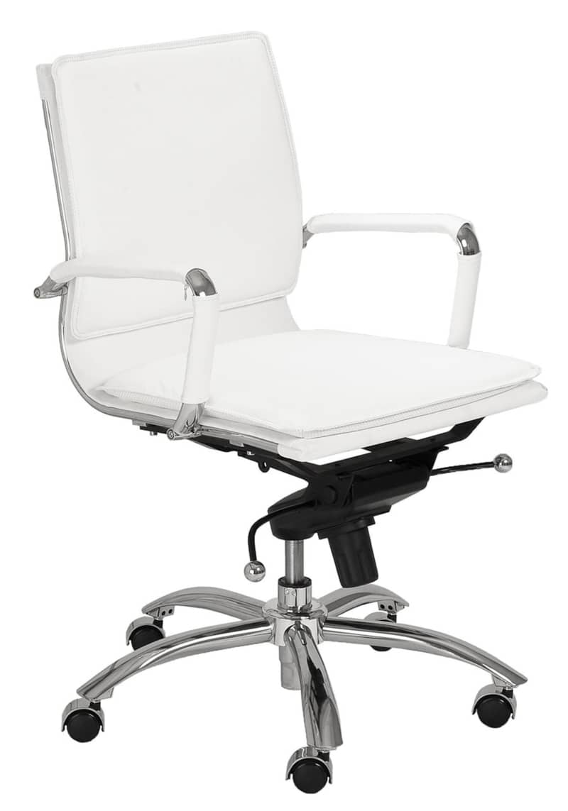 Euro Style 01263WHT Gunar Pro Low Back Office Chair In White w/ Chromed Steel BaseThe five-leg pedestal on wheels is reliable and sturdy no matter how you roll. The rest is pure style. The feel of leather and the easy-to-use tilt mechanism are perfect when you want to lean into your work in comfort. Features