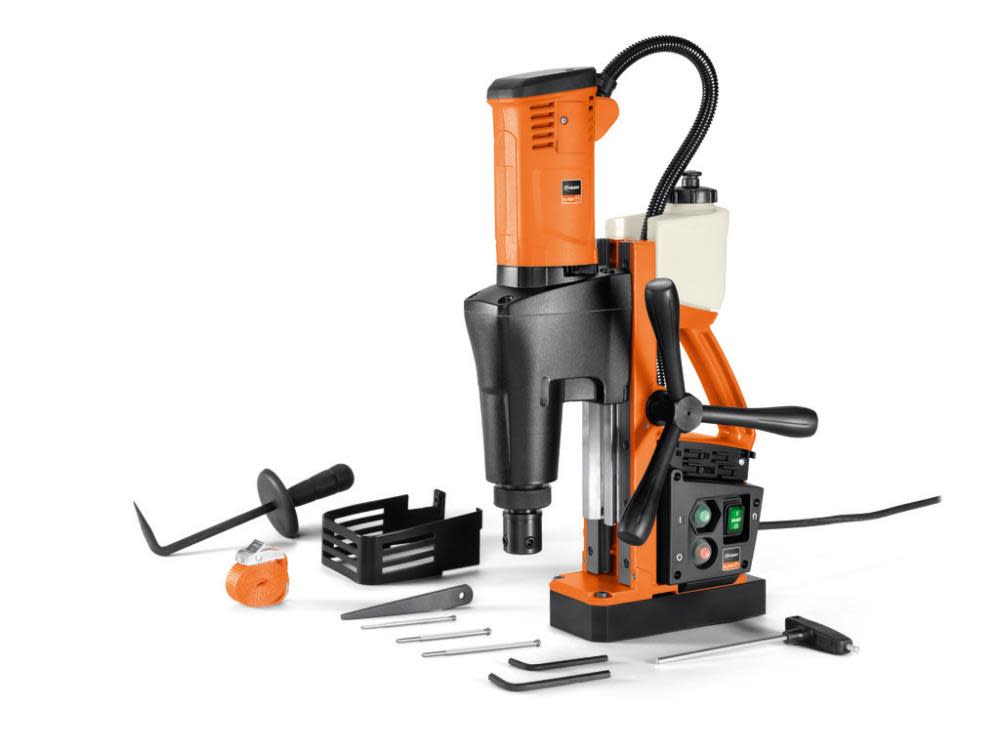 Lightweight and powerful 2-speed endurance magnetic base drill with MT3 tool mounting and basic functionality for core drilling and twist drilling in the workshop and at the construction sites .
