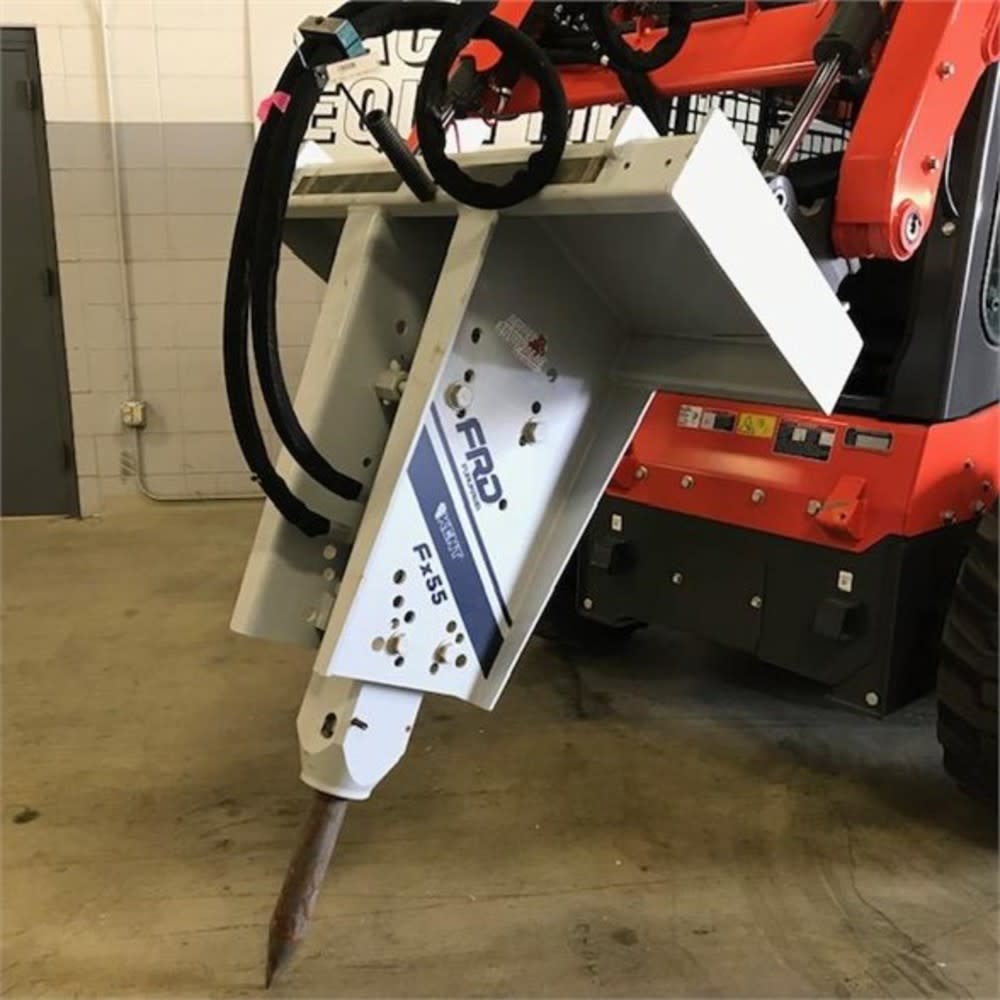 Furukawa / FRD (Kent) Hydraulic Breaker – Universal Skid Steer Mount These dependable hammers are available in a variety of mounting configurations enabling them to be easily attached to mini-excavators, skid-steer loaders and rubber-tired backhoes. Performance features and mounting options make these hammers ideal for site preparation, foundation removal, road repair, driveway and sidewalks or pedestrian bridges. The unique mono-block design is a result of years of engineering refinement and field experience. Two moving parts simplifies the hammer operation and reduces the chance of downtime. The advanced hydraulic circuit provides increased flow to the valve and piston, resulting in faster cycle times, increased tool penetration and more productivity per hour than on previous models. There are no through-bolts to constantly torque or replace and the front wear bushing is easily replaced so your hammer is always in perfect working condition. The wider oil flow range is an example of the hammers superior design, allowing for faster striking speeds and the ability to be used on a wider range of carriers. The nitrogen charged backhead increases the impact energy maximizing hammer production. WARNING: California’s Proposition 65 Features ??? Performance features and mounting options make these breakers ideal for site preparation, foundation removal, road repair, driveway and sidewalks or pedestrian bridges. ??? Carrier machine information is required when registering breaker for warranty; please be ready to share make, model and serial number of the carrier machine when purchasing. ??? Call to confirm mounting bracket will work with your machine or if you need a mount that is not listed. ??? A variety of mounting options that can accommodate any carrier or application ??? Accommodates a wide variety of working steels ??? Designed with replaceable cylinder liners saving maintenance cost and downtime ??? Nitrogen charged backhead increases impact energy, maximizing hammer production ??? Long front head bushing keeps steel in proper alignment for maximum service life ??? The unique mono-block design is a result of years of engineering refinement and field experience. two moving parts simplifies the hammer operation and reduces the chance of downtime. ??? Oval retaining pin for increased steel contact and double service life. ??? Mono-block design with only two moving parts reduces maintenance ??? Replaceable front wear bushing keeps tools in peak performance ??? The advanced hydraulic circuit provides increased flow to the valve and piston, resulting in faster cycle times, increased tool penetration and more productivity per hour than on previous models. ??? There are no through-bolts to constantly torque or replace and the front wear bushing is easily replaced so your hammer is always in perfect working condition. ??? The wider oil flow range is an example of the hammers superior design, allowing for faster striking speeds and the ability to be used on a wider range of carriers. the nitrogen charged back-head increases the impact energy maximizing hammer production. ??? In the rare event that maintenance is needed, the FSA series has been designed with replaceable cylinder liners saving maintenance cost and downtime. ??? This breaker is configured to fit a 2-lever universal skid steer quick attach mount. ??? Hoses and standard working steel is included. ??? Breaker ships on a pallet. Specifications ??? Acme Tools Air Shipment Restricted N ??? Acme Tools Brand Name FURUKAWA ROCK DRILL USA ??? Acme Tools Part Number FX55 SS ??? Additional Contents Hoses, working steel Assembled ??? Weight (lbs) 840 ??? Brand / Model Compatibility Skid steer loaders with 2 lever quick attach ??? Color / Finish Gray and dark blue ??? Connection Design Quick Coupler ??? Country of Origin USA ??? Height (in) 24 ??? Hydraulic Maximum Flow Rate (gpm) 22.5 ??? Hydraulic Minimum Flow Rate (gpm) 10.5 ??? Internal Supplier Part # FX55 SS ??? Internet Product Code (IPC) E4B1BB25BBE ??? Length (in) 61 ??? MFG Model # (Series) FX55 ??? MFG Part # (OEM) FX55 ??? Manufacturer Warranty One Year Limited Warranty ??? Maximum Torque (ft-lbs) 800 ??? Package Weight 840 ??? Product Name FRD (Kent) Hydraulic Breaker – Universal Skid Steer Mount ??? UPC 406055000383 ??? Weight (lbs) 940 ??? Width (in) 2.36 Acme Equipment is here to provide you all of the information you need to make an educated purchase, as well as support you after the sale with parts, service, and warranty. Give us a call, and let us help you make a great investment. *** We Ship To All 50 States. We Have a Loading Dock, Forklift and Loading Personnel ***