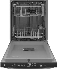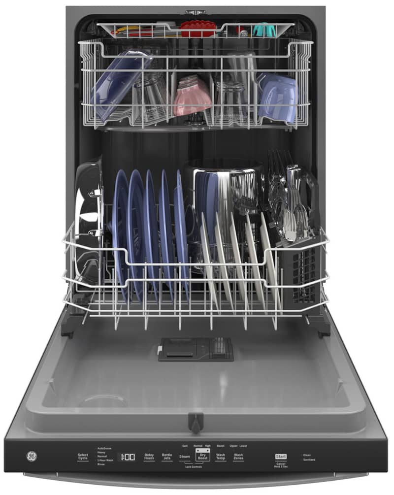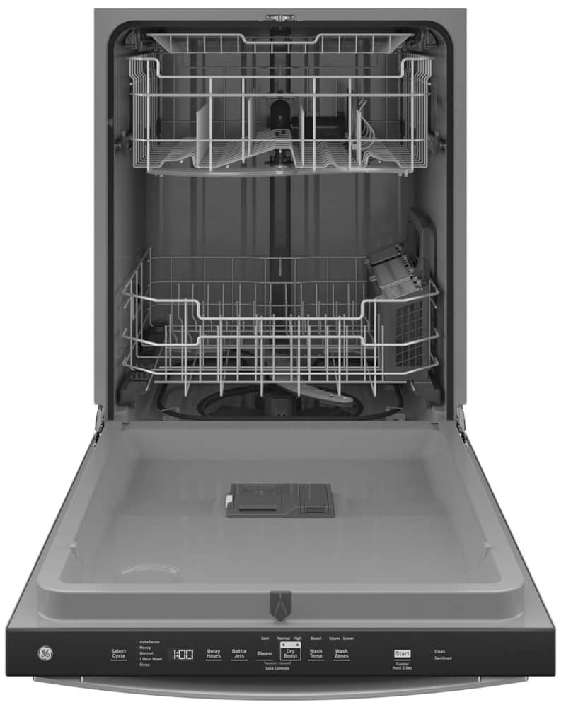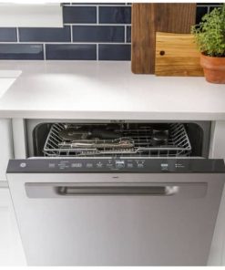 GE 24?? Stainless Steel Top Control DishwasherThere is nothing worse than running out of dishwasher space with just a few plates to go. Luckily, with the GE 24″ stainless steel dishwasher with sanitize cycle and Dry Boost?, you get that extra space for those pesky extra dishes and much more. This washer??s third rack can be altered to fit any assortment of dishes that a conventional dishwasher just can??t hold. Not to mention the wide variety of additional features this dishwasher brings to the table. For instance, the built-in bottle jets allow the washer to thoroughly clean taller containers, like narrow jars and glasses, so all the hard-to-reach places are totally covered. Sometimes dishes have dense food residue that is typically impossible to eliminate with the dishwasher alone. But with this GE stainless steel dishwasher, no residue is safe from the thorough steam option that allows you to loosen what??s left on the plate before the wash cycle begins. Plus, you can dispose of harder foods altogether with The Piranha food disposer, which eliminates larger particles with a stainless steel blade that can spin at 3,600 RPM. Set It and Forget ItWith the included leak sensor, you get all the benefits of Active Flood Protect which prevents overflows by shutting down the cycle and alerting you with flashing lights and audible tones. This GE stainless steel dishwasher also has the ability to wash a half load of dishes in half the standard load time or raise the height to meet the levels of your exact floors. Keep your dish-washing volume to a lower level with a 50 dBA washing volume, so you can keep your kitchen peaceful at all times. This GE kitchen appliance is a no brainer, but if you??re still looking for assistance in your product decision, check out our dishwasher buying guide to make sure you make the right call. You can also call 866-292-7565 to speak with an Abt specialist to ensure you have all of your questions answered. Features