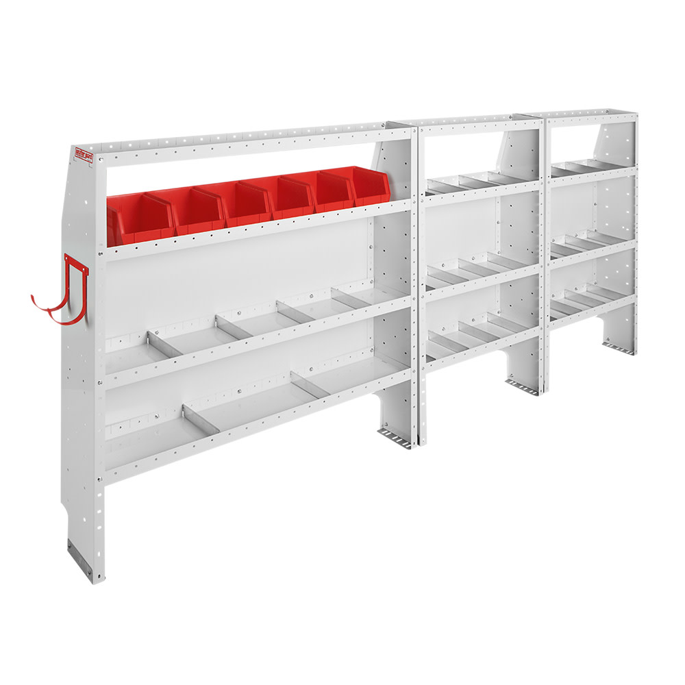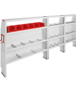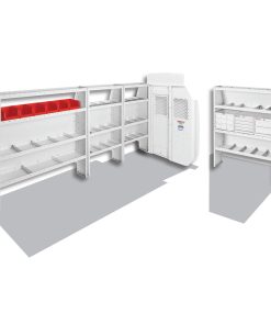 Includes 60in high adjustable cargo van shelving and a mesh van bulkhead with swinging door kit