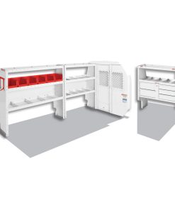 Designed for contractors, remodelers or other general service providers, the WEATHER GUARD Model 600-8111R van package for Full-Size, 130in wheel base Ford Transit vans provides adjustable cargo van shelving sized to fit the commercial van interior, 6 medium storage bins, a 5-drawer secure storage cabinet, and accessories. It includes a sturdy van bulkhead for maximum protection against shifting loads. Additional van products are available to create a custom van storage solution.