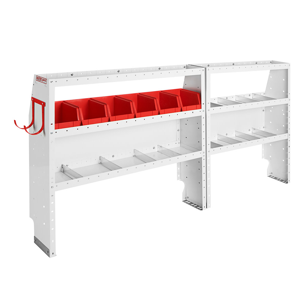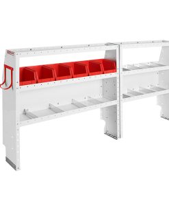 Includes 44in high adjustable cargo van shelving and a mesh van bulkhead with swinging door kit