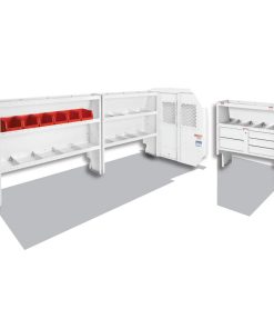 Designed for contractors, remodelers or other general service providers, the WEATHER GUARD Model 600-8111L van package for Full-Size, 148in wheel base Ford Transit vans provides adjustable cargo van shelving sized to fit the commercial van interior, 6 medium storage bins, a 5-drawer secure storage cabinet, and accessories. It includes a sturdy van bulkhead for maximum protection against shifting loads. Additional van products are available to create a custom van storage solution.