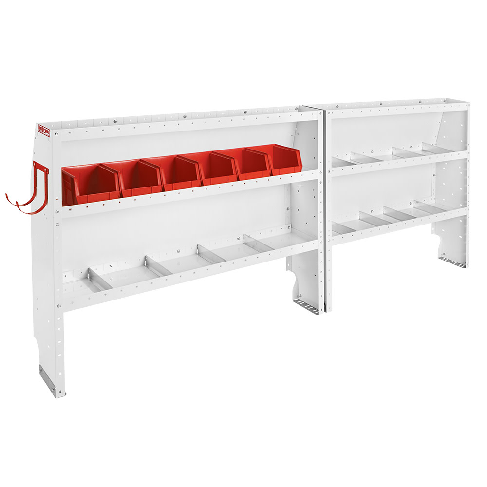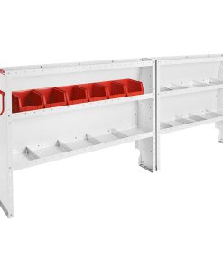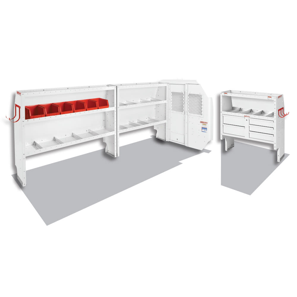 Includes 44in high adjustable cargo van shelving and a mesh van bulkhead with swinging door kit