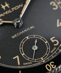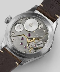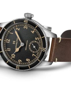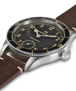 Hamilton H76719530 Khaki Aviation Pilot Pioneer Black Dial Brown Leather Strap Watch, 43mmInspired by the Model 23, a cutting-edge pocket watch used by U.S. soldiers during WWII, the Khaki Pilot Pioneer’s distinctive design is a tribute to Hamilton’s aviation and military heritage. The sporty yet refined pilot watch retains an indisputably technical feel with its handwinding mechanical movement, bi-directional rotating bezel and prominent winding crown. Available with a sleek stainless steel or unique bronze case, this 43mm timepiece is ready to fly. |