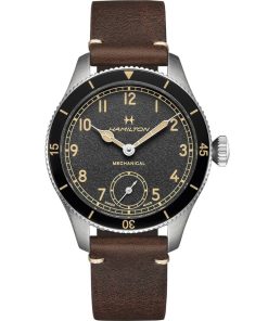 Hamilton H76719530 Khaki Aviation Pilot Pioneer Black Dial Brown Leather Strap Watch, 43mmInspired by the Model 23, a cutting-edge pocket watch used by U.S. soldiers during WWII, the Khaki Pilot Pioneer’s distinctive design is a tribute to Hamilton’s aviation and military heritage. The sporty yet refined pilot watch retains an indisputably technical feel with its handwinding mechanical movement, bi-directional rotating bezel and prominent winding crown. Available with a sleek stainless steel or unique bronze case, this 43mm timepiece is ready to fly. |