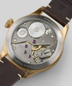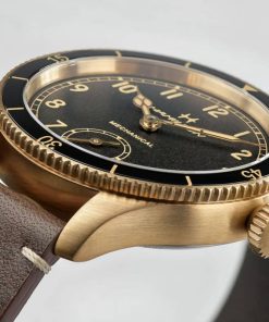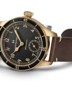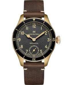 Hamilton H76709530 Khaki Aviation Pilot Pioneer Bronze Black Dial Brown Leather Strap Watch, 43mmInspired by the Model 23, a cutting-edge pocket watch used by U.S. soldiers during WWII, the Khaki Pilot Pioneer’s distinctive design is a tribute to Hamilton’s aviation and military heritage. The sporty yet refined pilot watch retains an indisputably technical feel with its handwinding mechanical movement, bi-directional rotating bezel and prominent winding crown. Available with a sleek stainless steel or unique bronze case, this 43mm timepiece is ready to fly. |