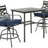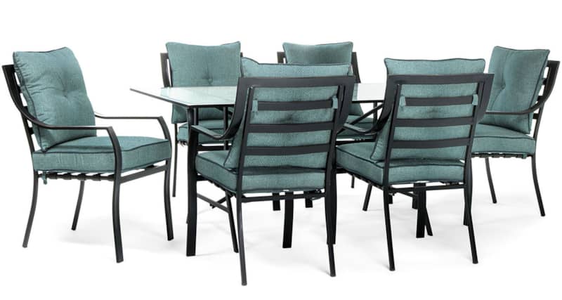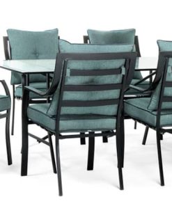 Hanover LAVDN7PC-BLU Lavallette 7-Piece Outdoor Dining Set In Ocean BlueThe Lavallette 7-Piece Outdoor Dining Set includes a decorative table with an inset tempered glass top and six comfortable chairs, complete with plush cushions. This set was designed to mix contemporary design with classic comfort ?C thus, while it looks incredibly modern and stylish, it also features soft and squishy cushions designed for maximum comfort. Both the table and chair frames are constructed of rust-resistant, heavy-duty steel and have been powder coated to increase their life spans. Plus, all pieces are easy to put together and will provide years of carefree maintenance and enjoyment. Some assembly is required. Features