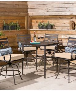 Hanover MCLRDN5PCBRTAN Montclair 5-Piece Outdoor High Dining Set In Tan/Brown With 4 Swivel Chairs, 33″ Square High Dining TableSpend more time outdoors with the Montclair 5-piece high-dining patio set from Hanover. This space-friendly dining set includes four swivel chairs and a 33-inch square dining table. The sleek, modern frames are forged out of heavy-duty steel and treated with a multi-step finish for the ultimate outdoor protection. Items within the Montclair Collection are designed to be durable, functional, and timeless. Designer details include curved backrests, elegant curling arms, and swivel-action chair bases that can sweep guests off their feet into a full 360-degree spin. Each chair is topped with thick foam cushions and pillows that allow you to entertain your guests in fashionable comfort. The fabric is soft to the touch, yet durable enough to resist moisture, stains, and UV harm. Entertain in style and comfort all year long with the Montclair Collection. Features