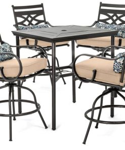 Hanover MCLRDN5PCBRTAN Montclair 5-Piece Outdoor High Dining Set In Tan/Brown With 4 Swivel Chairs, 33″ Square High Dining TableSpend more time outdoors with the Montclair 5-piece high-dining patio set from Hanover. This space-friendly dining set includes four swivel chairs and a 33-inch square dining table. The sleek, modern frames are forged out of heavy-duty steel and treated with a multi-step finish for the ultimate outdoor protection. Items within the Montclair Collection are designed to be durable, functional, and timeless. Designer details include curved backrests, elegant curling arms, and swivel-action chair bases that can sweep guests off their feet into a full 360-degree spin. Each chair is topped with thick foam cushions and pillows that allow you to entertain your guests in fashionable comfort. The fabric is soft to the touch, yet durable enough to resist moisture, stains, and UV harm. Entertain in style and comfort all year long with the Montclair Collection. Features