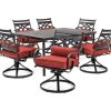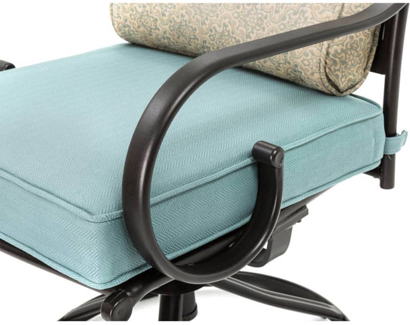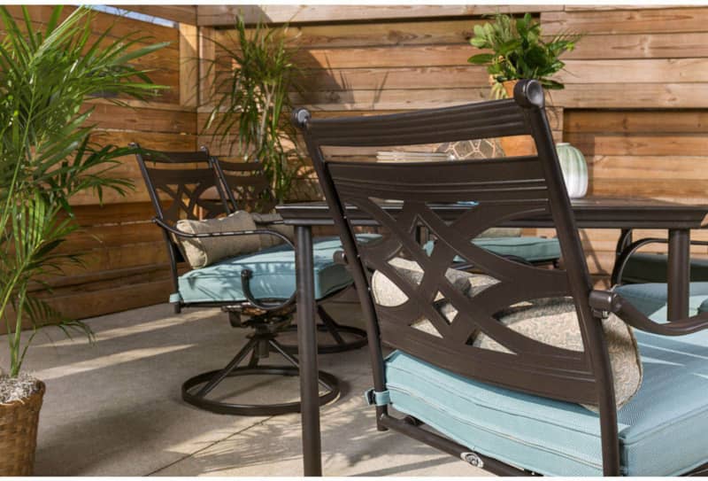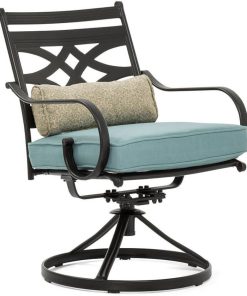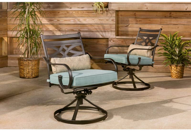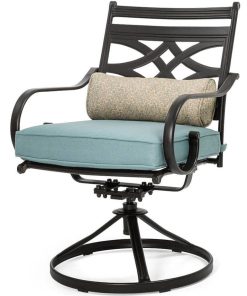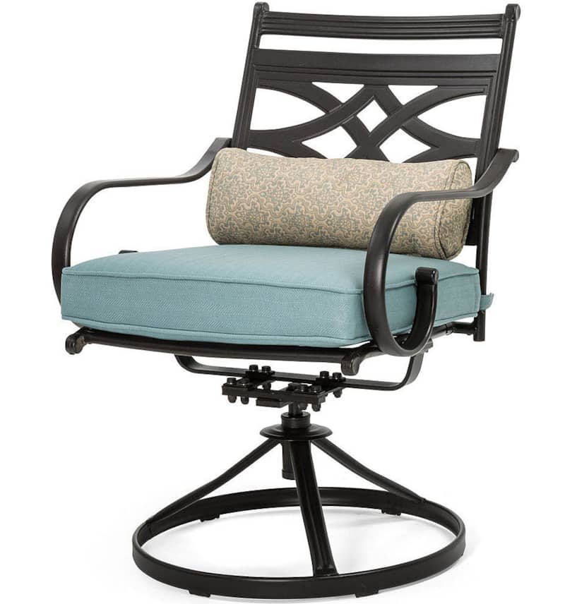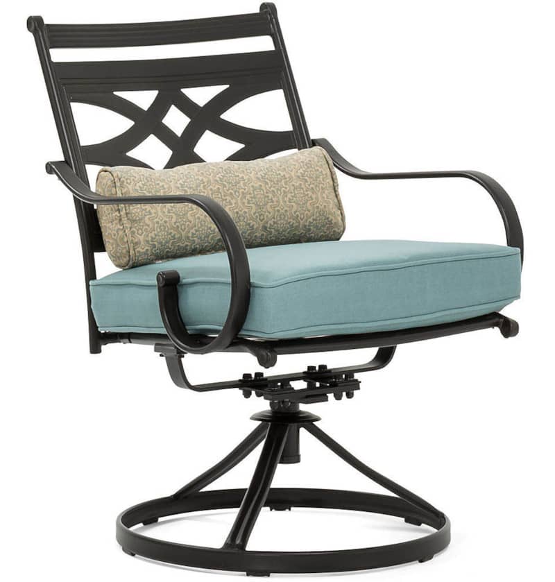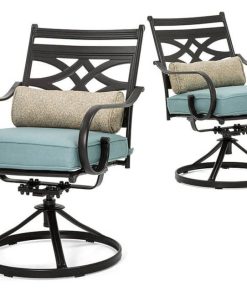 Hanover Montclair 7-Piece Dining Set In Ocean Blue With 6 Swivel Rockers And A 40″ x 67″ Dining Table – MCLRDN7PCSQSW6-BLUSpend more time outdoors with the Montclair 7-piece patio set from Hanover. This outdoor dining set includes six swivel rockers and a 40″ x 67″ dining table. The sleek, modern frames are forged out of heavy-duty steel and treated with a multi-step finish for the ultimate outdoor protection. Items within the Montclair Collection are designed to be durable, functional, and timeless. Designer details include curved backrests, elegant curling arms, and swivel-action chair bases that can sweep guests off their feet into a full 360-degree spin. Each chair is topped with thick foam cushions and pillows that allow you to entertain your guests in fashionable comfort. The fabric is soft to the touch, yet durable enough to resist moisture, stains, and UV harm. Entertain in style and comfort all year long with the Montclair Collection. Features