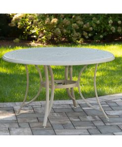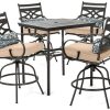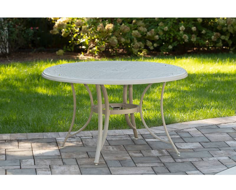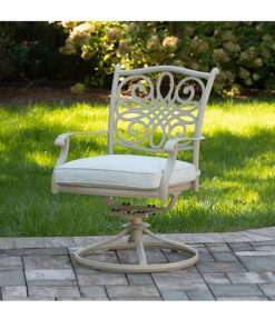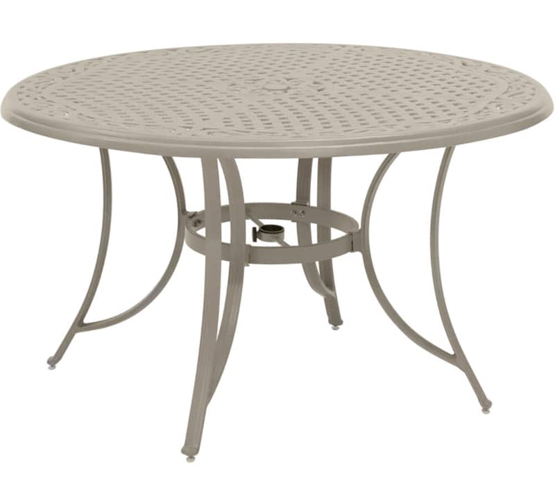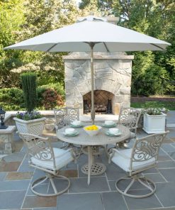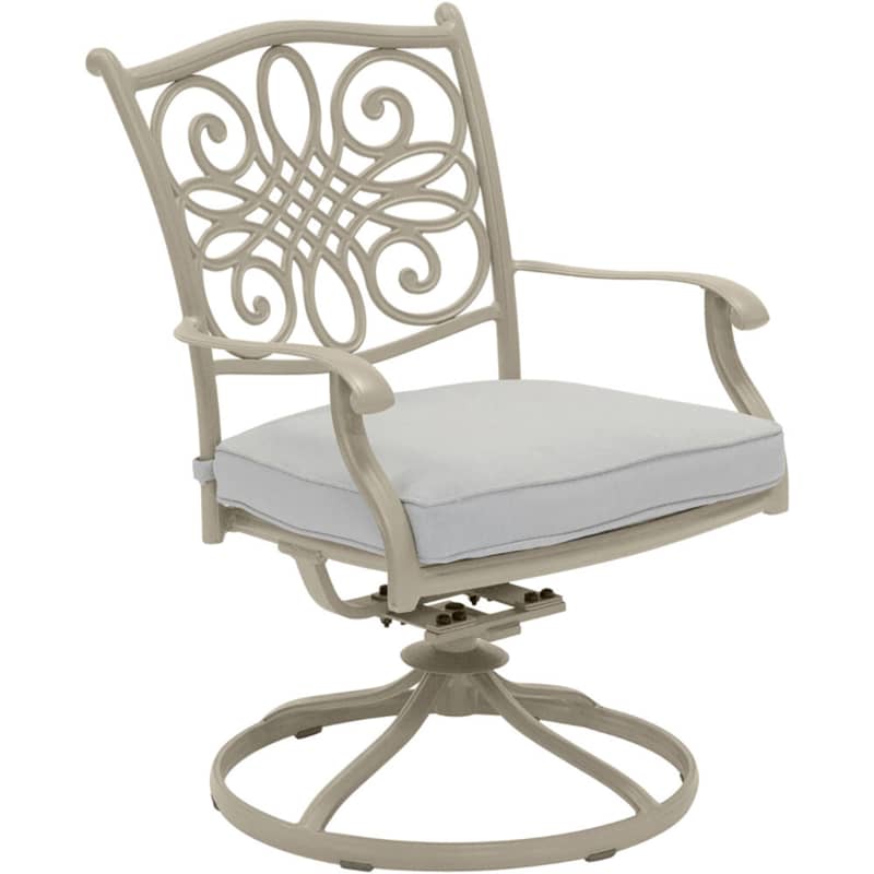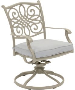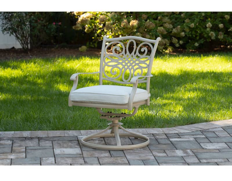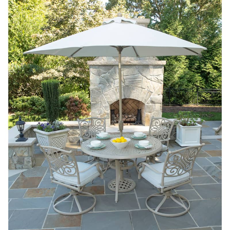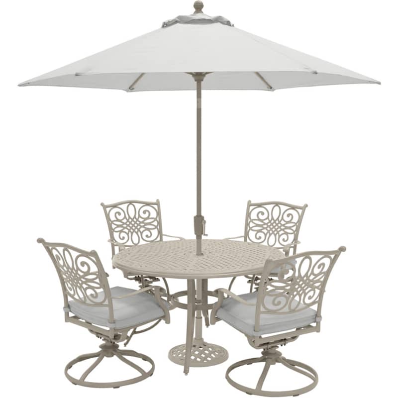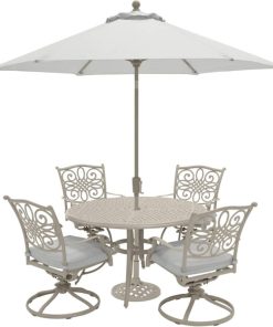 Hanover TRADDNSD5PCSW4-BE-SU Traditions 5-Piece Outdoor Dining Set In Beige/Sand With 4 Swivel Chairs, 48″ Cast-Top Table With Umbrella & StandThe Traditions 5-Piece Dining Set beautifully transforms any backyard into an elegant outdoor dining area with its superior quality and deep comfort feel. This set includes one 48 in. round table, four swivel rocking chairs, four seat cushions, one table umbrella and umbrella stand. Both the chairs and table have alumnicast frames featuring heavy gauge and rust resistant aluminum-alloy extrusions with uniquely supported inner walls. Each chair performs a smooth, 360-degree spin and gentle rocking motion without affecting their stance. The cushions are built to last with a high grade of 100% polyester wrapped around polyurethane foam, ensuring deep comfort while maintaining its original full shape. The fabric is also specifically designed, woven, and treated for quick drying while resisting stains and UV harm. Designed to last, this 5-piece outdoor dining set will surely provide you with a natural alternative to entertaining indoors. Minor assembly is required. Features