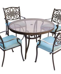 Hanover Traditions 5-Piece Outdoor Dining Set In Blue/Bronze With 4 Dining Chairs, 48″ Glass-Top Table