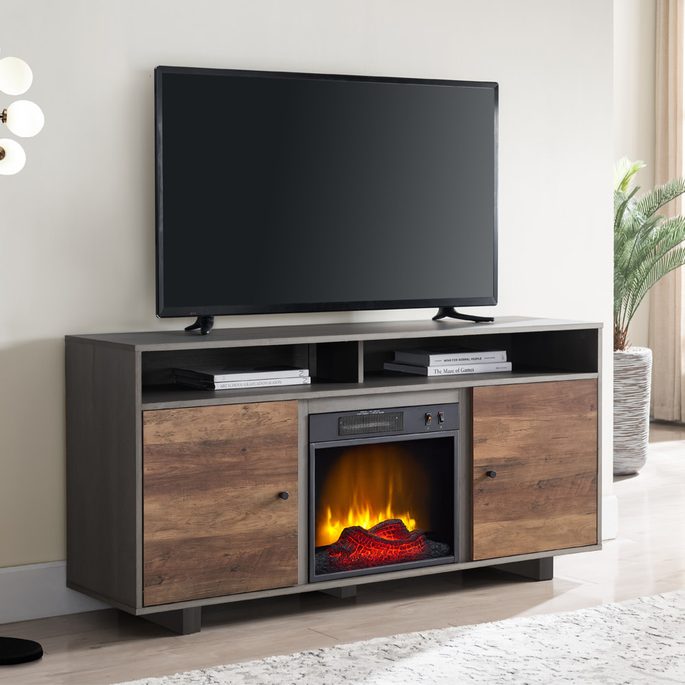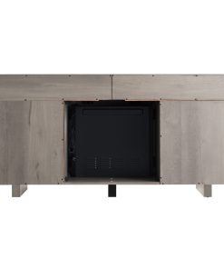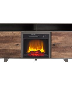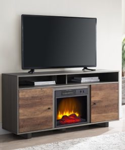 Contemporary style two-tone Media Electric Fireplace with soft gray finish contrasted by plank style doors bringing warmth, light and design to your home. Open storage shelf for electronic components above the fireplace insert. Covered storage behind the two doors, hides the clutter giving you a clean organized look to your home. Fireplace insert bring instant romance to any space and operates with and with out the built in heater.