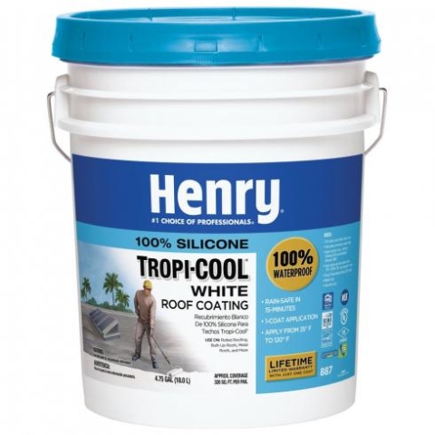 Henry 887 Tropi-Cool® 100% silicone white roof coating is a premium, 100% silicone, moisture-cure coating designed to reflect the sun’s heat and UV rays as well as protect many types of roofs. While suitable for use in all climates, the 100% silicone chemistry is especially suited for extreme tropical environments, which are exposed to some of the hottest and wettest weather with intense UV exposure. It is specially designed to maintain maximum reflectivity of heat and UV rays as it ages. Its moisture-cure chemistry creates a very aggressive chemical bond with the roof, which provides permanent ponding water resistance, extreme durability and superior capabilities of sealing and protection.