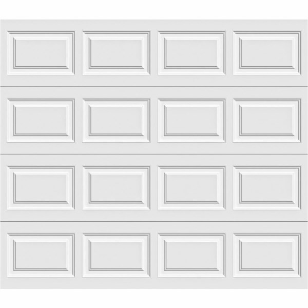 Gold series door. 1-3/8-inch polystyrene insulation pressure bonded between 2 layers of 27-gauge steel. Up to 6.5 R-value. Weather tight tongue and groove joints. Rust-proof aluminum retainer with a U-shaped vinyl floor seal to help keep out wind, rain, and snow. White stucco textured interior. Long-lasting nylon rollers. Includes interior locking mechanism, rails, and automatic opener reinforcement. Wood grain textured classic raised panel design. Limited lifetime paint system warranty, 3-year hardware warranty.