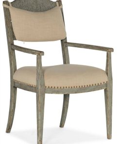 Hooker Furniture 6025-75301-90 Dining Room Alfresco Aperto Rush Arm Chair In OysterEvoke a welcoming European farmhouse with the charming and distinct Aperto Rush Arm chair. The comfortable upholstered seat covered in the ecru-colored Chimay Linen performance fabric is trimmed in light bronze nailheads, and a removeable back cushion offers neck and head support. The light gray finish has a distressed antiqued appearance, and the woven corn leaf back gives tactile appeal. Delivering the casual look and feel of ageless pieces acquired during travels in the Old World, Hooker Furniture is featuring Alfresco, a whole-home collection with relaxed European provincial styling. The Alfresco collection has a well-traveled aesthetic that is inspired by heirloom pieces found in homes perched on cliffs along the Italian coastline of the Adriatic Sea. The collection of bedroom, dining room, occasional and accent furniture features moderately distressed designs that are enhanced by accent paint finishes that create an eclectic feel. Alfresco is constructed of oak, maple and hickory veneers and poplar solids, and includes several pieces with stone and metal accents. Features