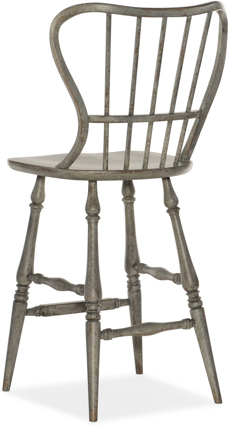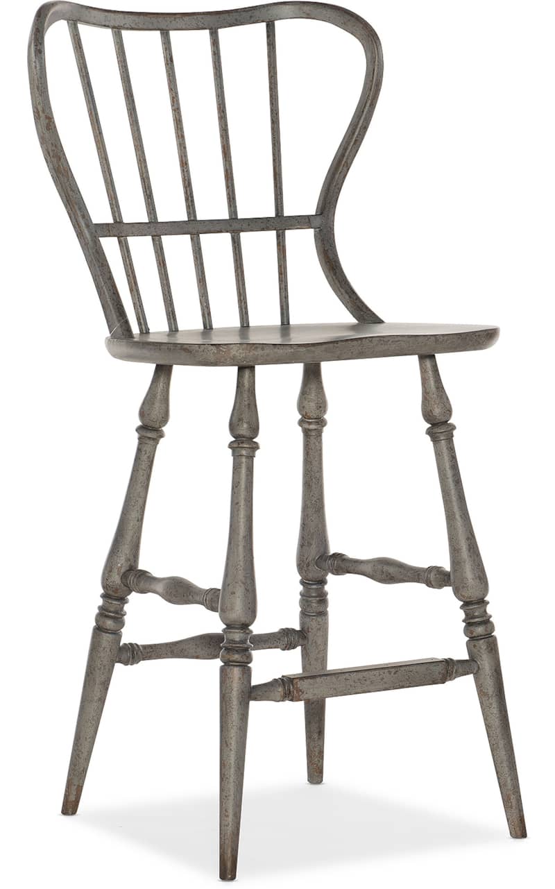 Hooker Furniture Dining Room Ciao Bella Spindle Back Bar Stool – 5805-75361-96With a casual chic spin on classic European farmhouse and cottage style, the graceful silhouette of the Ciao Bella Spindle Back Bar Stool is destined to be a favorite of family and guests alike. The compelling Speckled Gray finish with a gently worn antique patina and hand distressing adds to the charm and versatility. 48 _ inches high. Inspired by the small farmhouses that dot the French and Italian countryside and have been in the hands of the same family for generations, Hooker Furniture introduces the rustic Ciao Bella Collection. The whole home collection is an eclectic mix of European farmhouse pieces that have the appearance of furniture that has been refinished multiple times as it has passed through the generations. Ciao Bella includes bedroom, dining room, occasional, home office and accent furniture, and features a finish called Timeworn Gray that accentuates the historical nature of European farmhouses – many of which include a variety of furniture styles that have been added by each generation of owners. Features